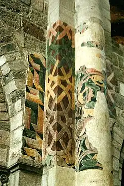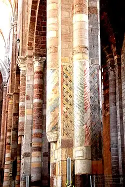 An drei Pfeilerreihen, die des Narthex eingeschlossen, sind ebenso bedeutende Malereifragmente erhalten. Die kräftige Gliederung der Pfeiler ließ allerdings jede großformatige Dekoration nicht zu. Dieses Problem hielt die Maler nicht davon ab, eine Vielzahl von dekorativen Motiven zu präsentieren, wie etwa Bänder, Flechtwerk, Ranken und Draperien. Die Kompositionen werden erst etwa in Drittelhöhe der Pfeiler umfassender. Die Künstler sahen sich völlig frei in ihrer Themenwahl. Das Thema „Bestiarium“ ist häufig vertreten. Die SW-Seite des SW-Pfeilers gehört zu den besterhaltenen Fresken. Hier waren seitlich der halbrunden Säule insgesamt sechs schlanke, hohe Streifen des Pfeilerkerns zu bemalen. Alle zeigen ein üppiges Dekor von Ranken und Bändern, die in vielfältigen geometrischen Figuren mit verblüffenden perspektivischen Effekten geformt worden sind. Die Falten der Bänder wechseln von ockerfarben, über rosa, blau bis hin zu grau. Die Ranken beginnen oberhalb der Kämpferplatte des Kapitells. An den Kanten wachsen sie aus dem gewaltigen Maul einer teuflischen Maske. Die halbrunde Säule zeigt ein außergewöhnliches Motiv: zwei große, sich gegenüber stehende Mantelpaviane mit auberginefarbenen Mänteln auf weißem Grund. Ein kleines Hinweisschild zwischen beiden trägt den Schriftzug: B(RIV)AS, Brioude (?).