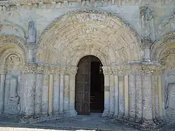 Wie oft bei den Archivoltenportalen in der Saintonge ist das Hauptthema ihrer Skulptur der Kampf zwischen den Gewalten des Guten und des Bösen.