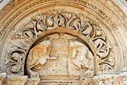 Die Plastiken in den Tympana der Scheinportale sind stark verwittert und kaum noch erkennbar. Im linken Tympanon könnte eine echsenartige Gestalt dargestellt sein, die einen Menschen ergriffen und emporgehoben hat. Im rechten hocken zwei Gestalten (eine tierisch, die andere menschlich?) gegenüber, offenbar bereit, sich aufeinander zu stürzen.