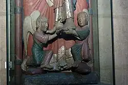 - An der Scheitelwand des Chores befindet sich eine Steinskulptur aus dem 16. Jahrhundert mit der Darstellung des heiligen Martin, der auf einem Pferd sitzt und seinen Mantel mit einem Bettler teilt.[5]