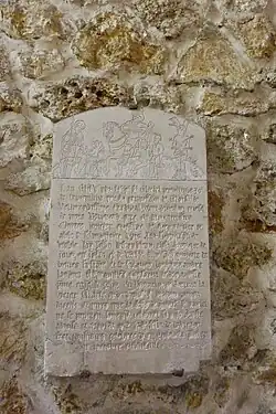 - Eine Gedenktafel mit einer Weiheinschrift und der Jahreszahl 1549 erinnert an die Weihe der im 16. Jahrhundert neu errichteten Kirche. Im oberen Teil der Steinplatte sind Reliefdarstellungen eingraviert. Links sieht man den heiligen Rochus von Montpellier mit einem Hund zu seinen Füßen und einem Engel, der seine Wunden versorgt, in der Mitte den heiligen Martin, der seinen Mantel mit einem Bettler teilt, und rechts den heiligen Sebastian, der, an einen Baum gebunden, von Pfeilen durchbohrt wird.[3]