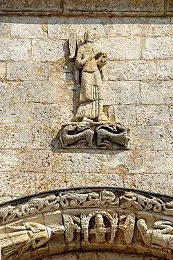 Das Hauptportal hat stirnseitig vier gestaltete Archivolten. Die innere Archivolte wird von elf Reliefs in Kreisringform geschmückt, darin je ein Engel mit ausgebreiteten Flügeln und erhobenen Händen, in radialer Anordnung.