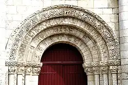 Die große Archivolte überdeckt mit etwas Abstand zum Archivoltenfenster das ganze Mittelfeld. Hier wird das Thema vom „Gleichnis der klugen und törichten Jungfrauen“ vorgetragen, eines der häufigsten in der romanischen Baukunst der Saintonge.