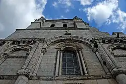 Der im Grundriss quadratische Turm ist zentriert auf die Breite des Hauptschiffs. In Höhe der beiden Geschosse seiner Fassade ist er „künstlich“ nach Süden hin verbreitert worden, um die in der Romanischen Saintonge gewohnte Fassadenausdehnung und deren Gliederung unterbringen zu können. Das bedeutet aber, dass im Gesamtüberblick die oberen Stockwerke des Turms nicht zentrisch über der Fassade angeordnet sind.
