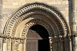 Das Ausmaß der figuralen Ausstattung der Archivolten und Gewände hält sich in Grenzen. Von den fünf Archivolten ist nur die innere figürlich vollplastisch und mit höchster Qualität herausgearbeitet. Es geht um die Aneinanderreihung von Greifvögeln (Phönix ?), in den Krallen überdimensional große Köpfe von Menschen, deren Körper sich auf der Innenseite der Archivolte krümmen und winden. Sind da etwa empor getragene Seelen von Menschen gemeint? Jede Figur ist anders als alle anderen. Die nächsten vier Archivolten sind nur auf den Fronten und nur sehr einfach gestaltet, mit längs verlaufenden Rundstäben, wiederkehrendem Blättermotiv und einfachen geometrischen Formen wie Waffelmuster.