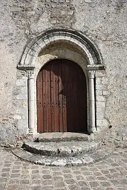 In den Giebel der ansonsten schmucklosen Westfassade sind zwei Rundbogenfenster eingeschnitten. Das Westportal wird ins 12. Jahrhundert datiert. Es ist von Archivolten umgeben und wird von zwei Säulen gerahmt, die mit Volutenkapitellen verziert sind. Auf dem linken Kapitell ist eine Figur mit erhobenen Armen dargestellt, auf dem rechten Kapitell sind Fratzen zu erkennen.