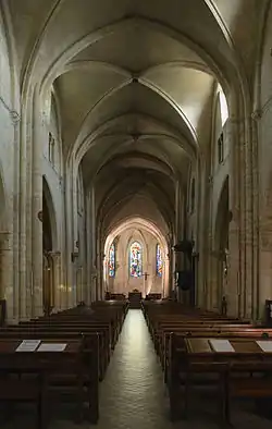Saint-Pierre de Montmartre ist eine dreischiffige Pfeilerbasilika mit einem vierjochigen Langhaus. Die Seitenschiffe haben noch romanische Kreuzgratgewölbe, in Längsrichtung spitzbogig, in Querrichtung rundbogig. Die Spitzbogenarkaden die auf Pfeilern mit Säulenvorlagen ruhen, trennen das breitere Mittelschiff von den beiden Seitenschiffen. Die Öffnungen des Triforiums sind Biforien, die waagerecht mit Architraven schließen. Seitenschiffsfenster und Obergaden sind rundbogig. Das Querhaus ragt kaum über das Langhaus hinaus. Zwischen dem Querhaus und der dreiteiligen Apsis liegt ein Chorjoch. Die nördliche Apsis ist der älteste Teil der Kirche. Sie trägt eine Halbkuppel aus unregelmäßigem Mauerwerk und wird von zwei Rundbogenfenstern erhellt. Die Südapsis ist stärker restauriert. Die Mittelapsis mit ihren schlanken Säulen, ihren Kapitellen mit eingerollten Blättern und ihrem Kreuzrippengewölbe gehört bereits der Gotik an und wird von drei großen Spitzbogenfenstern beleuchtet.