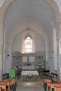 Das Langhaus ist ein schlichter, einschiffiger Raum. Es wird von einer Holzdecke gedeckt und durch einen Schwibbogen unterteilt. Ein zugespitzter Bogen öffnet das Langhaus zum gerade geschlossenen Chor, der von einer Spitztonne überwölbt wird. Der Chor wird von je zwei seitlichen und einem großen Fenster in der Stirnwand beleuchtet. In die Südwand des Chors sind zwei spitzbogige, aufwändig verzierte Arkaden eingeschnitten, in denen Piscinen eingebaut sind.