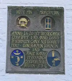 Heute mir – morgen dir. Anno 1610 wurde diese Kapelle gebaut und anno 1660 wiederum völlig erneuert und verbessert von Harmen Warner und Jakob Hanke, zur Zeit Kirchengeschworene zu Jever. Gott allein (sei) die Ehre.“