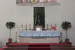 Sieben Stufen führen zum ursprünglichen Hauptaltar. Unter diesen Stufen wurde seinem Testament gemäß Kaiser Maximilian I. im Jahr 1519 als Büßer, aber im Ornat des St.-Georgs-Ritterordens beigesetzt. Der erste, gotische Hochaltar soll mit einem Gemälde Albrecht Dürers – „Die Taufe im Jordan“ geschmückt gewesen sein. Erzherzog Maximilian III. ersetzte diesen durch einen Flügelaltar. 1770 wurden von Kaiserin Maria Theresia ein neuer Hochaltar gestiftet und die beiden Seitenaltäre durch barocke Altäre ersetzt. Eine Statue des Hl. Georg, die im Zeitraum des St.-Georgs-Ritterordens auf dem Hochaltar stand, wurde auf dem früheren Hauptaltar aufgestellt. Diese Mailänder Bronzearbeit aus der Zeit Kaiser Friedrichs III. wurde 1948 gestohlen und in 14 Teile zerschlagen, konnte aber wieder restauriert werden. Zwischen Volksaltar und rechtem Seitenaltar steht die Kathedra, der Bischofsstuhl des österreichischen Militärbischofs mit dessen Wappen und Wahlspruch.