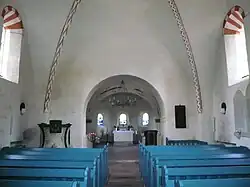 Das Gebäude ist ein innen wie außen weiß verputzter romanischer Back- und Sandsteinbau mit einer Gesamtlänge von 31,5 Metern und einer Breite von bis zu zehn Metern. Zwei Kreuzrippengewölbe dominieren den Innenraum der Kirche. Eines von ihnen kulminiert direkt über der Orgel auf ihrer Empore, während das andere den Großteil der Sitzbänke überspannt. Beide sind acht Meter hoch, 7,75 Meter breit und sechs Meter lang und werden von einem gleichförmigen, zwölf Meter hohen Satteldach bedeckt. An die Gewölbe schließt sich nach Osten der 6,25 Meter lange, 6,5 Meter breite und 6,25 Meter hohe Chor- oder Altarraum an, der spätromanische Spuren aufweist. Über ihm ist das Dach 9,5 Meter hoch. Den Abschluss der Kirche bildet nach Osten die Apsis mit einer Höhe von bis zu 4,75 Metern. Sie ist 6,5 Meter breit und 2,5 Meter tief.