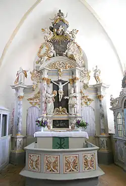 Der barocke Schnitzaltar wurde 1752 von Michael Müller aus Stralsund gefertigt. Farblich gefasst wurde er von dem Maler Gerlach aus Stralsund. Vier korinthische Säulen finden freistehend im Halbrundbogen ihre Mitte. Die Skulpturen von Aaron mit Weihrauchgefäß und Moses mit den Gesetzestafeln zeigen auf den gekreuzigten Jesus in der Mitte. Unmittelbar unterhalb in der Predella sieht man eine Darstellung des letzten Abendmahles. Der Halbbogen ist mit Muscheldekor versehen, darüber sitzen zwei Frauengestalten. Zwei weitere Frauengestalten stehen auf den seitlichen Säulen. Die mit vielen Ornamenten geschmückte Altarwand wird durch eine Erdkugel bekrönt, auf dieser thront, von Engeln umgeben, die Dreieinigkeit.