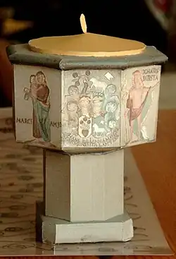 Der als einziges aus der alten Kirche übernommene achteckige Taufstein trägt auf einer Seite die Figur und den Namen Johannes’ des Täufers, auf fünf weiteren die der Erzengel Michael, Uriel, Jeremiel, Rapuhel und Gabriel.[8]