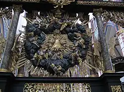 Die zehn um das trinitarische Dreieck mit dem Gottesnamen JHWH als Cherubim und Seraphim gruppierten plastischen Engelsfiguren spielen auf die zehn Emanationen Gottes (Sephiroth) an.[7] Der Kommunikant soll an dieser Stelle im Sinne der Glaubensgewissheit bestärkt und gleichzeitig auf den Empfang des Kelches vorbereitet werden, worauf sich auch die über der Gloriole befindliche Ölbergszene bezieht. Diese ist während der Auslagerung im Zweiten Weltkrieg verloren gegangen und wird heute durch ein modernes Relief von Doris Waschk-Balz vertreten.