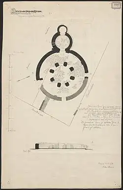 Der Rundbau hatte einen Innendurchmesser von 23 m. Die Decke wurde im Inneren von acht Pfeilern getragen. Diese Pfeiler teilten die Rundkirche in einen umlaufenden Raum und einen Mittelraum mit acht Metern Durchmesser. Der Mittelraum hatte vermutlich eine höhere Deckenhöhe als der umlaufenden Raum. Sowohl der runde Chor als auch die nördlich angrenzende halbkreisförmige Sakristei hatten den gleichen Durchmesser wie der Mittelraum.[1] An den Chor schloss sich Richtung Osten eine ebenfalls runde Apsis an. Diese Bauform ist nirgends sonst belegt. Im Westen und Süden befanden sich Portale.[3]