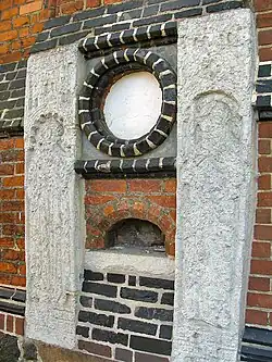 Die Außenverzierung der Kirche besteht aus großen spitzbogigen Fenstern und flachen Lisenen mit aufgelegten Verzierungen aus glasierten Ziegeln und Formstücken, die mit Wimpergen geschmückte Nischen bilden. Unterhalb einer Reihe von Nischen befinden sich Konsolen aus sehr realistisch und individuell gestalteten Terrakottaköpfen. Es sind wohl Porträts angesehener Stettiner Bürger aus dem Mittelalter und Stifter der Kirche.