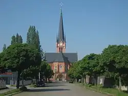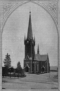 Der neugotische Backsteinbau fasst 645 Personen. Der 68 Meter hohe Turm wird von einem vergoldeten Turmknauf und einem verzierten Kreuz bekrönt. Beim Anbau der Sakristei 1906–1907 entstanden rund um die Apsis zwei Räume, die über eine eigene Treppe erreicht werden können. Für den Treppenaufgang schuf Otto Petrenz 1909 ein großes rundes Majolika-Relief. Es stellt den auferstandenen Christus und die erschrockenen Wächter am Ostermorgen dar. Über dem Treppenbogen sind die Petrusworte zu lesen: „Herr, wohin sollen wir gehen? Du hast Worte des ewigen Lebens!“ (Joh 6,68 ).