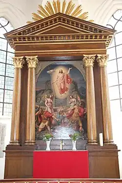 Das klassizistische Altargemälde, das die Auferstehung Jesu zeigt, stammt von Johann Ludwig Lund (1819) und wurde von Friederike Brun gestiftet. Die Taufe aus Bronze wurde 1830 hergestellt.