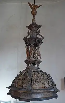 Der pokalförmige Taufstein von 1575 besteht aus einem achteckigen Schaft und einer mit Akanthus verzierten Kuppa. Eine Inschrift zitiert die Bibelstelle Joh. 3,3: Wer nicht aus Wasser und Geist von Neuem geboren wird, kann nicht eingehen in das Reich Gottes sowie die Namen von Pastor und Kirchgeschworenen. Auf diese Rundform antwortet der Taufbeckendeckel, den Ludwig Münstermann 1623 schnitzte. Er hängt frei von der Decke herab, um nach Bedarf angehoben oder abgesenkt zu werden. Auf seiner kuppelförmigen Kalotte finden vier Apostel auf den felderteilenden Spangen Platz, vier als Halbfiguren in den namentlich bezeichneten Kartuschen neben acht Schilden mit Hausmarken der Stifter. In dem diese Kuppel bekrönenden, mehrgeschossigen Aufbau wird die Apostelreihe mit vier Freifiguren komplettiert, die wie Karyatiden die nächste Ebene der Bekrönung tragen. In der Mitte zwischen ihnen ist die Gruppe der Taufe Christi durch Johannes den Täufer zu erkennen. Die letzte Restaurierung von 1998 konnte zwar einige Verluste und Ergänzungen im Figürlichen nicht rückgängig machen, gibt aber einen guten Eindruck von der ursprünglichen Oberfläche mit ihren Lasuren, durch welche die beabsichtigten Unterschiede in der Tönung von Linden- und Eichenpartien sichtbar gemacht wurden. Eine Bemalung von 1637 wurde nicht rekonstruiert, weil entsprechende Befunde zu gering waren.