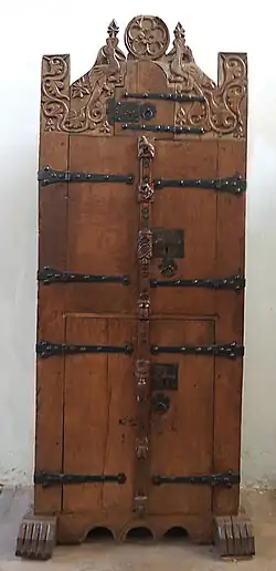 In der Kirche steht einer der ältesten noch erhaltenen Eichenbohlenschränke Deutschlands. Er stand ursprünglich in der Sakristei und diente zur Aufbewahrung heiliger Schriften. Die romanischen Rundbögen im Sockel am Fuß sowie der gotische Giebel deuten auf das 13. Jahrhundert als Zeitraum der Herstellung hin. Die Besonderheit des Schrankes ist die Leiste in der Mitte, die sieben unterschiedliche Reliefs aufweist. Köpfe, Turnierhelme, Schlangen und Blätter, einen Affen und einen Löwen zeigt die Schmuckleiste. Sie könnten auf den Sieg des Christentums über das Heidentum oder auch als Sieg des Guten über das Böse gedeutet werden.