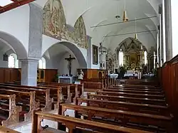 Der abgesetzte Chor ist mit einem gotischen Netzrippengewölbe aus dem 15. Jahrhundert versehen. Das Langhaus überspannt ein Tonnengewölbe mit Stichkappen. Der seitlich an dem Langhaus angebaute quadratische Turm mit Viereckhelm und Spitzbogenfenster weist Rundbogenfriese auf.