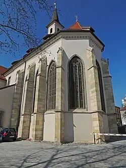 Die dreischiffige, gotische Staffelhalle ist traditionell nach Osten ausgerichtet. Von außen ist nur der Chor erkennbar, da die Seitenschiffe in der Barockzeit durch die Komtureigebäude überbaut wurden. Der gotische Chor, der drei Joche und einen dreiseitigen Chorschluss umfasst, ist durch Kaff- und Sockelgesimse gegliedert. Diese umlaufen auch die zweifach abgesetzten Strebepfeiler, deren Giebel jeweils von einer Kreuzblume bekrönt wird. Das Dachgesims mit einer Konsolenreihe ist wohl im Zuge der Barockisierung im späten 17. Jahrhundert hinzugekommen. Der sehr hohe und schlanke Turm befindet sich im Winkel zwischen Chor und nördlichem Seitenschiff. Er ist äußerlich schlicht und nur durch Ecklisenen gegliedert. In den beiden oberen Geschossen befinden sich großzügige Schallöffnungen. Den oberen Abschluss bildet eine mit Holzschindeln gedeckte Achteckspitze.[3]