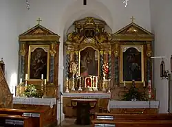 Der Innenraum des Chors, d. h. das Erdgeschoss des Chorturms, ist mit einem Kreuzgratgewölbe überspannt. Der Chorbogen verbindet ihn mit dem flachgedeckten Langhaus. Zur Kirchenausstattung gehört ein um 1730 gebauter Hochaltar mit je zwei Säulen an den Seiten, vor denen die Statuen des heiligen Sebastian und des heiligen Rochus stehen. Das nazarenische Altarretabel zeigt den heiligen Ägidius. Die Orgel auf der Empore wurde um 1720 von einem unbekannten Orgelbauer errichtet.[1]