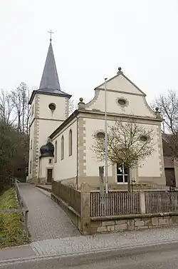 Vor dem Bau der Kirche wurde mehrere Jahrhunderte lang die evangelische Kirche des Ortes als Simultankirche, das heißt, von beiden Konfessionen gemeinsam genutzt. Diese Situation wollte der katholische Pfarrer Heider bei seinem Amtsantritt im Jahr 1908 ändern und entschloss sich zum Bau eines katholischen Gotteshauses im Ort. Es entstand ein Kirchenbauverein, die Männer des Ortes, die als Soldaten in den Ersten Weltkrieg zogen, versprachen, nach ihrer Heimkehr eine Kirche zu bauen.