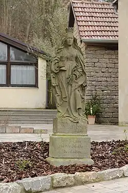 Alter und Herkunft der im rechten Vorgarten der Kirche befindlichen Freifigur sind unbekannt. Sie soll sich bereits vor der Entstehung der Kirche auf dem Kirchengelände, das zuvor ein Garten der Familie Kehl gewesen war, befunden haben. Die aus Sandstein befindliche Darstellung der hl. Barbara von Nikomedien, eine der Vierzehn Nothelfer, trägt auf dem Sockel die Inschrift „Bitte für uns in der Stunde des Todes“. Die Figur wurde im Jahr 1950 auf Veranlassung von Pfarrer Seufert restauriert.