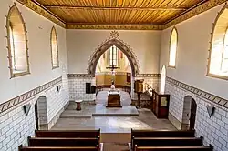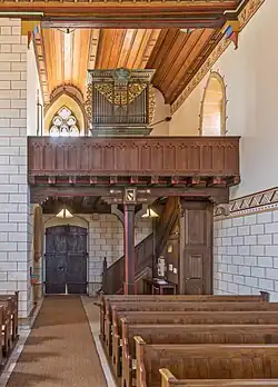 Im Inneren ist die Turmhalle, die Kapelle, mit hohlprofilierten Rippen versehen. Die äußeren Umfassungen der Öffnungen zum Eingang und zum Langhaus sind als älteste Bauteile zu erkennen.[16] Das Chorgewölbe weist entsprechende Rippen auf, die auf Konsolen aufsitzen; die Schlusssteine sind mit Blumen verziert. Bei der Renovierung 1902 wurde die flache Putzdecke im Langhaus abgeschlagen und durch eine farblich gefasste, gegliederte Holzdecke ersetzt, die über der Empore in längsliegenden Tonnen gegliedert ist. Aus dieser Zeit stammt auch die von einer Mittelstütze getragene, historisierende Holzempore.