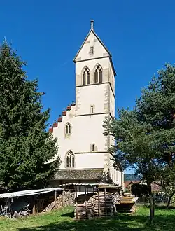 Das Langhaus ist ein einschiffiger, flachgedeckter Bau, an den sich nach einem spitzen Chorbogen der Chor anschließt, der – durch ein Joch abgesetzt – mit fünf Seiten eines Achtecks geschlossen ist. In das Langhaus ist der viergeschossige Turm eingestellt, der die romanische Form mit Satteldach bewahrt hat, im Obergeschoss aber je ein Paar gekuppelte zweiteilige gotische Maßwerkfenster mit Dreipässen aufweist; in den Untergeschossen finden sich leere spitzbogige Mauerschlitze. Der Turm hatte ursprünglich auf der zum Ort gelegenen Ostseite eine Sonnenuhr,[15] die durch eine mechanische Uhr ersetzt worden ist.