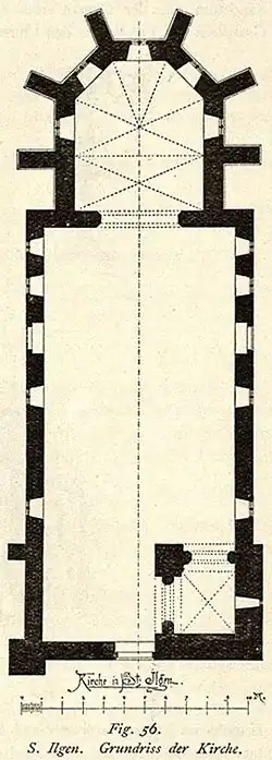 Pfarrer Lindemann selbst zog allerdings eine Ableitung von „St. Ottilien“ vor.[2] „Die Kirche von St. Ilgen, seit jeher zu St. Peter gehörig, sei ein ‚templum‘ oder ‚fanum <Heiligtum> Sanctae Ottiliiae‘; die erste Silbe von Ottilien sei weggefallen und man habe St. Iljen oder St. Ilgen daraus gemacht“[7] Auch für die Herleitung von St. Ottilien wird eine Legende angeführt. Die blinde Ottilia, Tochter eines elsässischen Ritters, habe einen ihr zugedachten, aber ungeliebten Mann nicht heiraten wollen und sei deshalb über den Rhein geflohen. Sie sei in ein kleines Dörflein gekommen, wo das Wasser einer Quelle der Blinden das Augenlicht wiedergegeben habe. Aus Dankbarkeit habe sie eine Kapelle über der Quelle errichten lassen und den Ort St. Ilgen genannt.[8] Dazu (wie auch zu der fränkischen Stiftung) würde es passen, dass bis in das 18. Jahrhundert St. Ilgen ein Wallfahrtsort gewesen sein soll, der überwiegend von Elsässern besucht worden sei, wobei einem Brunnen Heilwirkung zugeschrieben worden sei.[9] Tatsächlich steht die – trotzdem weithin sichtbare – Kirche nicht etwa an erhöhter Stelle, sondern in der Senke fast an der tiefsten Stelle des Ortes. Bei ihr ist zwar ein Brunnen zu finden, allerdings liegt sie nicht an einer Quelle, sondern am Hohlenbach. Ottilia wird zudem, mit etwas abweichender Legende, auch von anderen Orten in Anspruch genommen, so etwa von St. Ottilien in Freiburg.