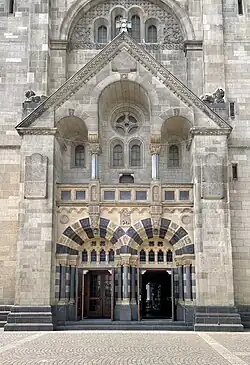 St. Adolfus folgt dem neoromanischen Stil. Die Kirche hat zwei Türme und ist als Basilika ausgelegt. Die Turmfassade, deren Aufbau starke Ähnlichkeit zur Turmfassade der Kirche St. Heribert in Köln-Deutz aufweist, bildet den Blickpunkt der Pfalzstraße.