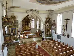 Wann die erste Orgel eingebaut wurde, lässt sich nicht mehr nachvollziehen. Im Jahre 1708 wird die erste bekannte Orgel eingebaut, sie wird im Jahre 1779 renoviert. Im Jahr 1822 wird ein neues Werk eingebaut, das vermutlich (keine Belege vorhanden) wieder ersetzt wird. Von den Gebrüdern Hindelang aus Ebenhofen wird die heutige Orgel im Jahr 1907 eingebaut. Dazu wird das vorhandene, historische Gehäuse vergrößert. Im Ersten Weltkrieg (1917) muss die Kirchengemeinde die Pfeifen aus Zinn abliefern. Als Ersatz werden Pfeifen aus Aluminium eingebaut. Im Jahr 1974 wird die Orgel durch Zeilhuber aus Altstädten überarbeitet. Die Traktur wird von pneumatischem Antrieb auf elektrischen Antrieb umgebaut, ein freistehender Spieltisch wird errichtet. Die Orgel hat 650 Pfeifen, organisiert in 14 Registern, verteilt auf zwei Manuale und das Pedal mit einem Tonumfang von C1 bis f5.[27]