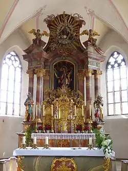 Die Seitenaltäre wurden vermutlich im Jahr 1676 erbaut.[12] Sie mussten wegen der Ungust der Zeiten im Jahr 1790 wieder restauriert werden. Zu dieser Zeit ist der Hochaltar Jesus, der rechte Seitenaltar Maria und der linke Seitenaltar Afra geweiht.[9] Sie wurden im Jahr 1857 wiederum renoviert, 1882 neu gefasst und in den Jahren 1857, 1922 und 1958 renoviert.[12] Im Jahr 1964 wird im linken Seitenaltar das Bild der Afra entfernt (seit dem im Pfarrhaus) und durch die geschnitzte, gefasste Figur (Bildhauer: W. Konrad) des Josef mit Jesuskind ersetzt.[13]