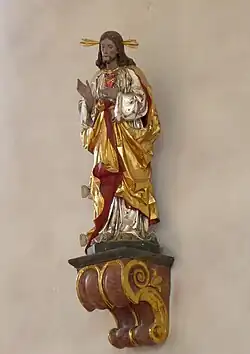 Eine gefasste Holzfigur, den Erzengel Michael darstellend, ist an der Südwand des Chores befestigt. Die Figur wurde 1695 von Michael Wagner gestiftet. Sie wurde im Jahr 1880 aus der Kirche entfernt und kehrte im Jahr 1956 wieder zurück.[23] Rechts daneben ist auf einem Sockel eine Herz-Jesu-Figur befestigt. Die Figur hat segnend die rechte Hand erhoben.[24] An der nördlichen Chorwand ist der Erzengel Raphael dargestellt. Diese Holzfigur schuf im Jahr 1958 der Schnitzer J. Konrad.[24] Links vom Erzengel Raphael steht die Figur des Heiligen Sebastian.[25]