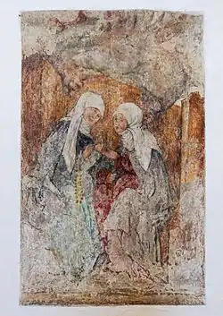Bei der Renovierung im Jahr 1921 werden an den Wänden des Langhauses Malereien aus dem 16. und 17. Jahrhundert freigelegt.[10] Die Bilder auf der Nordwand wurden wieder übertüncht.[11] In einer ersten Stellungnahme wird das eine Bild (datiert um 1520) als Geißelung der Schwatzhaftigkeit erkannt, aber später als Heimsuchung Mariens gedeutet. Es zeigt Maria und Elisabeth belauscht von einem Satan (undeutlich über den beiden Frauengestalten).[10] Das zweite Bild zeigt den Heiligen Martin, wie er mit dem Schwert seinen Umhang zerteilt. In der Inschrift (gemalter Sockel) ist vermerkt, dass dieses Bild von Johan Holtzey im Jahre 1625 gestiftet wurde.[11]