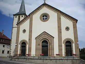 Am 21. Juni 1841 begann man den Altbau zugunsten eines Neubaus abzubrechen, wobei der 1579 erbaute Turm des Vorgängerbaus in das neue Bauwerk einging. Am 5. Oktober 1841 wurde der Grundstein gelegt.[3] Der bis 1846 fertiggestellte Bau erfolgte nach Plänen des Stuttgarter Architekten Gottlob Georg Barth unter der Leitung des Ludwigsburger Bauinspektors Ludwig Abel.[8] Ignaz Pfau, der Kirchhausener Geschichtsschreiber, weihte die Kirche am 1. November 1844 ein. Da Württemberg den Kirchenbau wesentlich finanzierte, entstand der Sakralbau im so genannten „Württembergischen Finanzkammerstil“.[3] Es entstand ein Deckengemälde, das von Anton Glassen aus Heidelberg geschaffen wurde und die Auferstehung und Himmelfahrt Christi, Sendung des hl. Geistes und Mariä Krönung zeigte.