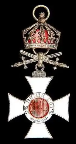 Für Militärverdienste konnte das Ordenszeichen ab diesem Zeitpunkt auch mit gekreuzten Schwertern zur Verleihung kommen, hierbei waren die Schwerter durch die Kreuzwinkel geführt, aber auch mit Schwertern am Ring (für Inhaber, die eine niedere Stufe mit Schwertern besaßen) hierbei wurden dazu zwei gekreuzte Schwerter zwischen Kreuz und Tragering angebracht.