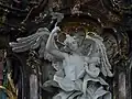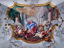 - Im Engelsfresko der Chorkuppel erscheint die Dreifaltigkeit über den neun Engelchören, im Schoß Gottvaters Jesus, sendungsbereit als Kind, und die Heilig-Geist-Taube (Johann Jakob Zeiller).