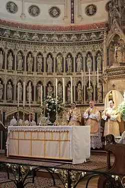 Die neugotische farbige Ausmalung wurde in den 1950er und 1970er Jahren durch eine schlichte, die Raumstruktur betonende weiße und graue Fassung ersetzt. Verblieben sind die figurenreichen Buntglasfenster. Reich ornamentiert ist die Decke, ein oben zugespitztes Tonnengewölbe. Den Höhepunkt der Ausstattung bildet die apsidiale Altarrückwand. Beidseitig des sakramentshausartigen Tabernakels im Zentrum enthält ein zweigeschossiger Fries 52 Statuen von heiligen Männern und Frauen aus der Bibel sowie aus der römischen und englischen Kirchengeschichte. Darüber befindet sich eine weitere Reihe von Tondi mit Heiligenköpfen.