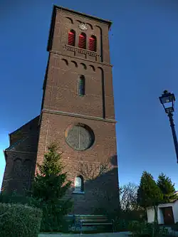 Die Kirche wurde 1883/84 nach den Plänen des Kölner Architekten August Carl Lange im Stil der Neuromanik errichtet, die feierliche Kirchweihe und die Weihe des Hochaltares nahm am 10. Juli 1886 der Kölner Erzbischof Philippus Krementz vor. In den Hochaltar wurden Reliquien des hl. Engelbert sowie von Märtyrern der Thebaischen Legion eingelassen.[3] Eine Vorgängerkirche ist bereits für das Jahr 1553 bezeugt. 1986 wurde die Orgel, welche sieben Register besitzt, durch die Firma Weimbs restauriert.[4]