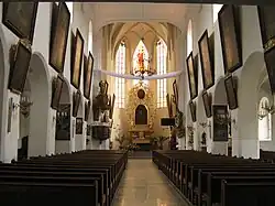Im Inneren ist der Bau eine flach gedeckte sechsjochige Pfeilerbasilika. Die Innenausstattung umfasste bis 1945 eine wertvolle Abendmahlsszene, Gemälde der Vierzehn Nothelfer aus der Willmannschen Schule. Die bereits elektrifizierte Orgel wurde 1945 mutwillig zerstört. Die Skulpturen am Hauptaltar mit den hll. Andreas und Hedwig, Herzogin von Schlesien, stammen von Tobias Stahlmeyster. Das Hauptaltargemälde Letztes Abendmahl und Gott der Vater wurden von Georg Wilhelm Neunhertz geschaffen.