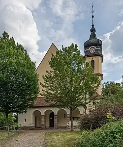 Der neobarocke Saalbau besteht aus einem Langhaus, einem eingezogenen, halbrund schließenden Chor und einem Chorflankenturm mit quadratischem Grundriss. Der Turm hat ein gestuftes Zwiebeldach, neben dem Langhaus steht auf der Westseite ein schmales Seitenschiff, das unter anderem den Beichtstuhl aufnimmt.[2]