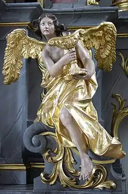 - Die Kanzel wurde 1785 angefertigt. Korpus und Schalldeckel sind mit Engelsputten besetzt und mit Rosetten und Girlanden verziert. Die Holzfigur auf dem Schalldeckel wird als Christus oder Johannes der Täufer gedeutet.