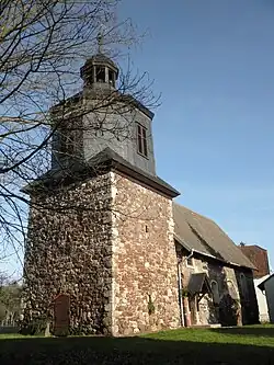 1756 erhielt das Kirchengelände eine Mauer. Den Turm betritt man von der Westseite. Der Raum im Turm besitzt ein Bruchsteingewölbe mit oktogonalem Fachwerkkreuz und welcher Haube. Schießscharten im Turm zeugen von der Wehrhaftigkeit im Mittelalter. Damals war die Wehrkirche mit meterhohen Mauern umgeben. 1930 wurden die Reste abgetragen.