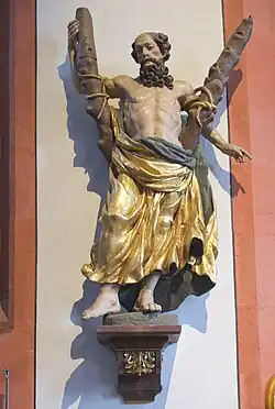 • Die Figur des heiligen Andreas am nördlichen Chorbogen ist eine Kopie. Das Original gehörte zum 1650 geschaffenen Hochaltar, der 1875 abgebrochen wurde.
