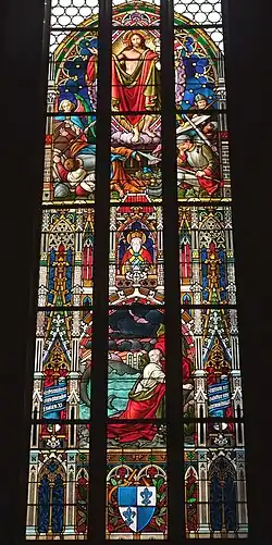 Die neugotischen Bleiglasfenster wurden zwischen 1876 und 1885 von der Glasmalerei Zettler in München geschaffen. Das zentrale Chorfenster stellt die Marienkrönung dar, die seitlichen Fenster sind den Geheimnissen des Glorreichen Rosenkranzes gewidmet. Auf der rechten Seite sieht man unter der Szene der Auferstehung Jesu die Errettung des Jona aus dem Wal, unter der Szene der Himmelfahrt Jesu sieht man den Propheten Elias, der mit seinem Feuerwagen zum Himmel fährt. Auf der linken Seite ist unter der Himmelfahrt Mariens die Begegnung der Königin von Saba mit König Salomon dargestellt.