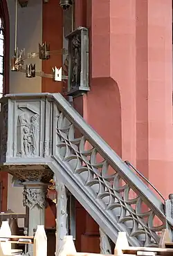 Die Kirche besitzt eine spätgotische Steinkanzel von 1523 aus der Werkstatt von Tilman Riemenschneider. Die vier Reliefs am Kanzelkorpus stellen die Kirchenväter Ambrosius, Augustinus, Hieronymus und Gregor den Großen dar. Ihnen sind die Symbole der Evangelisten Matthäus (menschliche Gestalt), Markus (Löwe), Lukas (Stier) und Johannes (Adler) zugeordnet. An der Kanzelrückwand ist Christus inmitten von Weinranken dargestellt.
