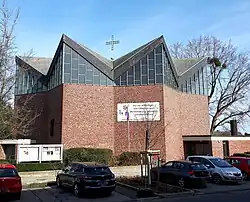Östlich des Haupteingangs liegt die rechteckige modern gestaltete und mit einem Pultdach, abgedeckte Werktagskapelle, die einen Zugang sowohl von außen als auch aus dem Kirchenraum besitzt. Die dreieckigen Fenster in den seitlichen Fassaden unter der Dachschräge der Kapelle sind eine Stiftung und wurden 1986 als Buntglasfenster von der Künstlerin Maria Katzgrau entworfen und in der Werkstatt der Glasmalerei Dr. H. Oidtmann angefertigt.[2]